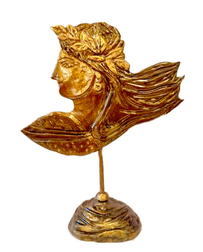 Χειροποίητο εντυπωσιακό επιτραπέζιο διακοσμητικό μικρογλυπτό, με το προφίλ μιας στεφανωμένης γυναίκας με κλαδί ελιάς, υλοποιημένο από πηλό και βαμμένο εξωτερικά με χρυσό μεταλλικό χρώμα και βερνίκι που προσδίδει αίσθηση γυαλάδας και λείας υφής. Όποιο και να είναι το στυλ του σπιτιού ή του γραφείου στο οποίο θα τοποθετηθεί σίγουρα θα κλέψει τα βλέμματα και θα σχολιαστεί από τους καλεσμένους σας. Ύψος: 22cm