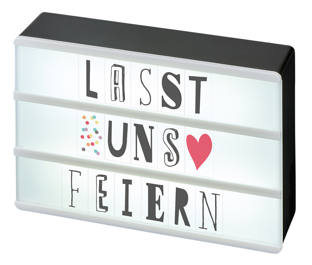 Δημιουργήστε νέα, μικρά μηνύματα Happy Me κάθε μέρα στο λαμπερό διακοσμητικό αξεσουάρ και απολαύστε τη ζωή χαρίζοντας χαμόγελα στα αγαπημένα σας πρόσωπα! - Διακοσμητικό φως LED σε στυλ παλιού κινηματογράφου - 3 σειρές για να σχεδιάσετε τον εαυτό σας με 120 γράμματα, αριθμούς και σύμβολα - για εσωτερική χρήση - λειτουργεί με μπαταρία και με μίνι σύνδεση USB, δεν περιλαμβάνονται μπαταρίες (4x AA) - κατασκευασμένο από πλαστικό