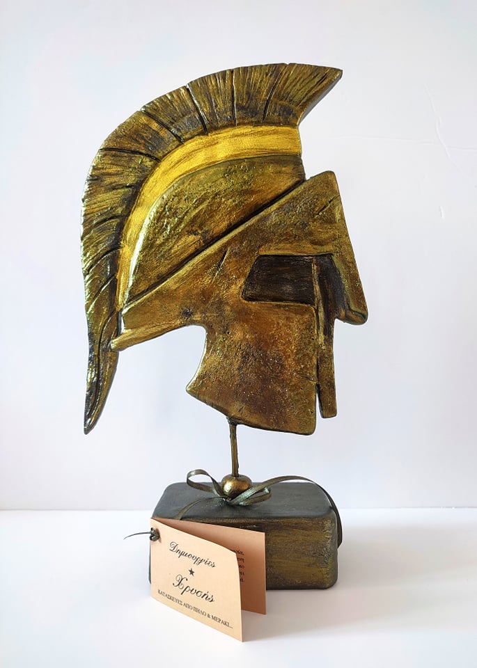 Χειροποίητο επιτραπέζιο διακοσμητικό μικρογλυπτό Σπαρτιάτικη Περικεφαλαία, υλοποιημένο από πηλό και βαμμένο εξωτερικά με χρυσό μεταλλικό χρώμα και βερνίκι που προσδίδει αίσθηση γυαλάδας και λείας υφής. Αυτή η Σπαρτιάτικη περικεφαλαία του Λεωνίδα είναι ένα εντυπωσιακό αναμνηστικό δώρο! Ένα μικρό κομμάτι της απίστευτης Αρχαίας Ελληνικής Ιστορίας ,θα διακοσμεί τον χώρο σας και θα κλέψει τα βλέμματα! Διάσταση 30*18cm