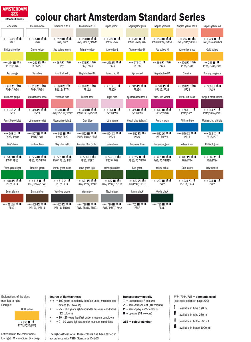 Τα ακρυλικά χρώματα του φημισμένου Ολλανδικού Οίκου Royal Talens είναι χρώματα που στεγνώνουν γρήγορα και 100 % με βάση ακρυλική ρητίνη (συνθετική διασπορά). Στη ζωγραφική σε καμβά μπορείτε να τα εφαρμόσετε σε λεπτά επιστρώματα άμεσα, με ή χωρίς νερό (αν προσθέσετε νερό θα έχετε εφέ ακουαρέλας).Τα χρώματα από την οικογένεια Amsterdam "Standard Series" είναι διαθέσιμα σε περισσότερες αποχρώσεις και μπορείτε να τα χρησιμοποιείτε σε όλες τις επιφάνειες.