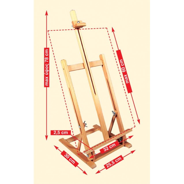 Τύπος : Επιτραπέζιο. Βάση : Τετράπλευρη. Είδος ξύλου : Ειδικά επεξεργασμένο μασίφ ξύλο Οξιάς. Ρυθμιζόμενη γωνία εργασίας : Ναι Ρυθμιζόμενο ύψος : Όχι Μέγιστο ύψος καμβά : 60 cm Μέγιστο πάχος καμβά : 2,5 cm Μέγιστο βάρος επιδεχόμενου φορτίου : 2 kg Βάρος καβαλέτου : Μέγιστο ύψος καβαλέτου : 78 cm To προϊόν πωλείται αποσυναρμολογημένο σε επίπεδη συσκευασία. Εμπεριέχονται οδηγίες συναρμολόγησης.