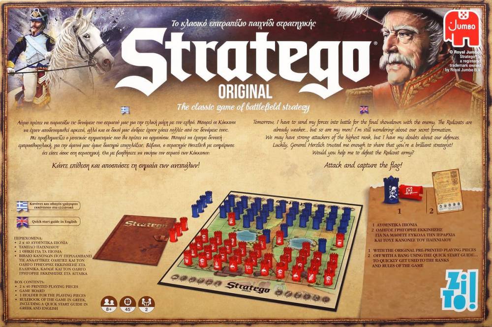 Το STRATEGO είναι ένα κλασικό επιτραπέζιο παιχνίδι στρατηγικής για δύο παίχτες! Παρατάξτε τον στρατό σας, εφαρμόστε την στρατηγική σας και κερδίστε τον αντίπαλο... Κάθε παίχτης ορίζει τον στρατό του που αποτελείται από 40 πιόνια, καθένα από τα οποία αντιπροσωπεύει συγκεκριμένη βαθμίδα αξιωματικών και στρατιωτών. Σκοπός του παιχνιδιού είναι να αποσπάσεις πρώτος τη σημαία του αντιπάλου ή να τον αναγκάσεις να μείνει με τόσο λίγα πιόνια ώστε να μην μπορεί πλέον να κινηθεί. Το Stratego έχει αρκετά απλούς κανόνες ώστε να παίζεται και από παιδιά. Ταυτόχρονα όμως έχει κι ένα βάθος στη στρατηγική που ενθουσιάζει και τους ενήλικες. "Αύριο πρέπει να παρατάξω τις δυνάμεις του στρατού μας για την τελική μάχη με τον εχθρό. Μπορεί οι Κόκκινοι να έχουν αποδυναμωθεί αρκετά, αλλά και οι δικοί μας άνδρες έχουν χάσει πολλές από τις δυνάμεις τους. Με προβληματίζει ο μυστικός σχηματισμός που θα πρέπει να οργανώσω. Μπορεί να έχουμε δυνατή εμπροσθοφυλακή, για την άμυνά μας όμως διατηρώ επιφυλάξεις. Βέβαια, ο στρατηγός Herzlich με ενημέρωσε ότι είστε άσος στη στρατηγική. Θα με βοηθήσετε να νικήσω τον στρατό των Κόκκινων;" Κάντε επίθεση και αποσπάστε τη σημαία των αντιπάλων! ΗΛΙΚΙΑ 8+++ Παικτες 2