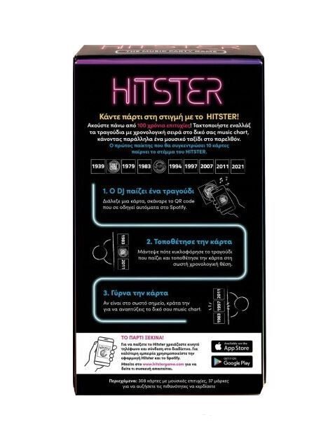 Κάντε Πάρτι στη στιγμή με το HITSTER. Ακούστε πάνω από 100 χρόνια επιτυχίες! Τακτοποιήστε εναλλάξ τα τραγούδια με χρονολογική σειρά στο δικό σας music chart, κάνοντας παράλληλα ένα μουσικό ταξίδι στο παρελθόν. Ο πρώτος παίκτης που θα συγκεντρώσει 10 κάρτες παίρνει το στέμμα του HITSTER. Ο DJ παίζει ένα τραγούδι. Διάλεξε μία κάρτα, σκάναρε το QR Codeπου σε οδηγεί αυτόματα στο Spotify. Τοποθέτησε την κάρτα. Μάντεψε πότε κυκλοφόρησε το τραγούδι που παίζει και τοποθέτησε την κάρτα στη σωστή χρονολογική θέση. Γύρνα την κάρτα. Αν είναι στο σωστό σημείο, κράτα την για να αναπτύξεις το δικό σου music chart. Το πάρτι ξεκινά! Για να παίξετε το Hitster χρειάζεστε κινητό τηλέφωνο και σύνδεση στο διαδίκτυο. Για καλύτερη εμπειρία χρησιμοποιήστε την εφαρμογή Hitster και το Spotify. Μπείτε στο www.hitstergame.com για να δείτε τι συσκευή απαιτείται. Το παιχνίδι περιλαμβάνει: 308 κάρτες με ελληνικές και διεθνείς μουσικές επιτυχίες 37 μάρκες για να αυξήσετε τις πιθανότητες να κερδίσετε Ηλικία 16+