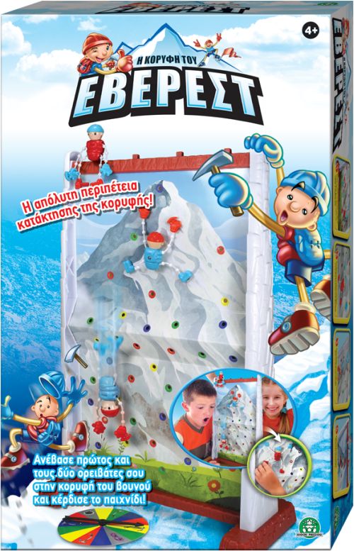 Η απόλυτη περιπέτεια κατάκτησης της κορυφής!Άρχισε να σκαρφαλώνεις προς την κορυφή του βουνού αλλά πρόσεξε που θα βάλεις το τσεκούρι σου. Ο αντίπαλός σου βρίσκεται στην άλλη πλευρά και ίσως προλάβει να σε ρίξει κάτω. Γίνε εσύ ο πρώτος που θα καταφέρεις να φτάσεις δύο ορειβάτες του ίδιου χρώματος στην κορφή του Έβερεστ και κέρδισε!Ένα πρωτότυπο παιχνίδι δράσης & στρατηγικής.Περιέχει: 1 βουνό/πάνελ 4 ορειβάτες 1 τροχό οδηγίες ΗΛΙΚΙΑ 4+