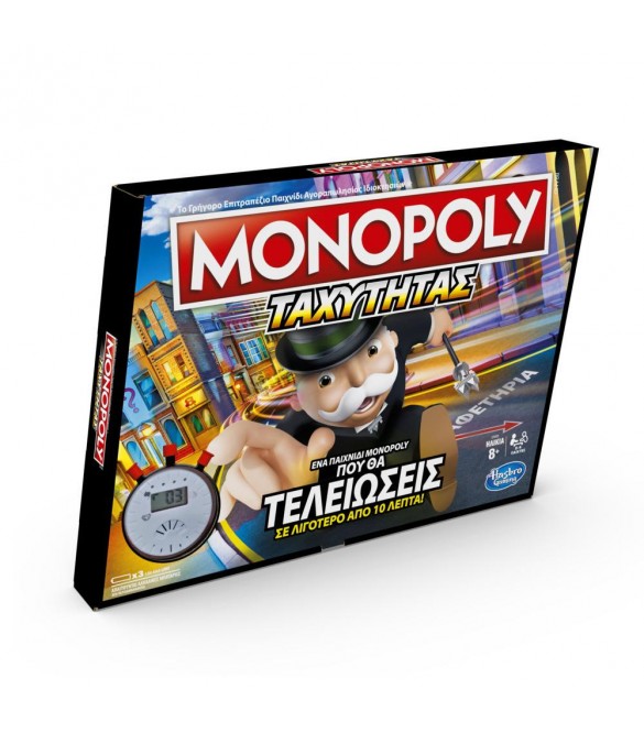 Δεν έχετε πολύ χρόνο; Κανένα πρόβλημα! Μπορείτε να παίξετε το επιτραπέζιο παιχνίδι Monopoly Ταχύτητας σε λιγότερα από 10 λεπτά! Όλοι ρίχνουν ταυτόχρονα τα ζάρια και κάνουν αγορές, επομένως δεν χρειάζεται να περιμένουν τη σειρά τους. Στους 4 γύρους, οι παίκτες προσπαθούν να νικήσουν το χρονόμετρο αγοράζοντας, ανταλλάζοντας και πουλώντας ιδιοκτησίες ταχύτερα από ποτέ. Το χρονόμετρο μετρά αντίστροφα σε κάθε στάδιο αγορών και συναλλαγών και δεν υπάρχει διάλειμμα ανάμεσα στα στάδια. Υπάρχουν ακόμα και 2 τετράγωνα αφετηρίας, ενώ, οι παίκτες μπορούν να βγουν από τη φυλακή κάθε φορά. Το επιτραπέζιο παιχνίδι Monopoly Ταχύτητας είναι ιδανική επιλογή για μια οικογενειακή βραδιά παιχνιδιού, για πάρτι με φίλους και για μια γρήγορη απόδραση από τη ρουτίνα της καθημερινότητας. Τα ονόματα και τα λογότυπα Hasbro, Hasbro Gaming, Parker Brothers και Monopoly, η χαρακτηριστική σχεδίαση του ταμπλό παιχνιδιού, τα τέσσερα τετράγωνα στις γωνίες, το όνομα και ο χαρακτήρας του Mr. Monopoly, καθώς και κάθε χαρακτηριστικό στοιχείο του ταμπλό και των περιεχομένων του παιχνιδιού είναι εμπορικά σήματα της Hasbro για το παιχνίδι αγοραπωλησιών ιδιοκτησιών και τον εξοπλισμό του παιχνιδιού. ΠΑΙΞΤΕ ΣΕ ΛΙΓΟΤΕΡΟ ΑΠΟ 10 ΛΕΠΤΑ: Θέλετε να παίξετε μια παρτίδα Monopoly αλλά δεν έχετε χρόνο; Οι παίκτες μπορούν στην πραγματικότητα να τελειώσουν μια παρτίδα παιχνιδιού Monopoly Ταχύτητας σε λιγότερο από 10 λεπτά ΠΑΙΞΤΕ ΣΕ ΧΡΟΝΟΜΕΤΡΗΜΕΝΟΥΣ ΓΥΡΟΥΣ: Αυτό το γρήγορο επιτραπέζιο παιχνίδι Monopoly παίζεται σε γύρους. Το χρονόμετρο μετρά αντίστροφα σε κάθε στάδιο αγορών και συναλλαγών του κάθε γύρου ΟΛΟΙ ΑΓΟΡΑΖΟΥΝ ΤΑΥΤΟΧΡΟΝΑ: Δεν χρειάζεται να περιμένετε τη σειρά σας! Κάθε παίκτης έχει ένα πιόνι και το αντίστοιχο ζάρι. Κατά τη διάρκεια των αγορών, όλοι ρίχνουν το ζάρι και αγοράζουν ταυτόχρονα ΠΟΛΥ ΓΡΗΓΟΡΕΣ ΣΥΝΑΛΛΑΓΕΣ: Οι κάρτες εντολών βοηθούν τους παίκτες να κάνουν συναλλαγές σε κάθε στάδιο συναλλαγών. Κερδίστε μπόνους στο τέλος του παιχνιδιού με τις κάρτες αποφάσεων ΔΙΑΣΚΕΔΑΣΤΙΚΟ ΟΙΚΟΓΕΝΕΙΑΚΟ ΠΑΙΧΝΙΔΙ: Όταν θέλε