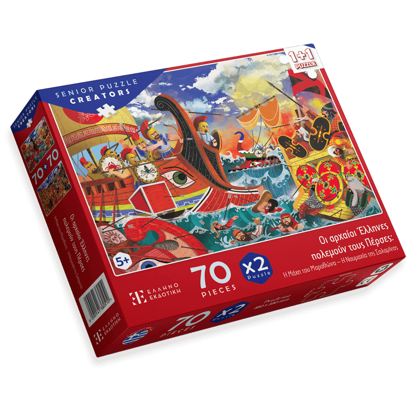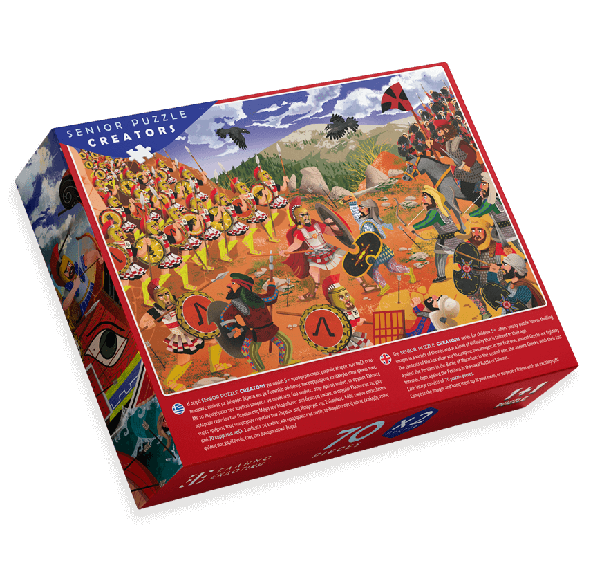 Η σειρά SENIOR PUZZLE CREATORS για παιδιά 5+ προσφέρει στους μικρούς λάτρεις των παζλ εντυπωσιακές εικόνες με διάφορα θέματα και με δυσκολία σύνθεσης προσαρμοσμένη κατάλληλα στην ηλικία τους. Με το περιεχόμενο του κουτιού μπορείτε να συνθέσετε δύο εικόνες: στην πρώτη εικόνα, οι αρχαίοι Έλληνες πολεμούν εναντίον των Περσών στη Μάχη του Μαραθώνα· στη δεύτερη εικόνα, οι αρχαίοι Έλληνες με τις γρήγορες τριήρεις τους ναυμαχούν εναντίον των Περσών στη Ναυμαχία της Σαλαμίνας. Κάθε εικόνα αποτελείται από 70 κομμάτια παζλ. Συνθέστε τις εικόνες και ομορφύνετε με αυτές το δωμάτιό σας ή κάντε έκπληξη στους φίλους σας χαρίζοντάς τους ένα συναρπαστικό δώρο!
