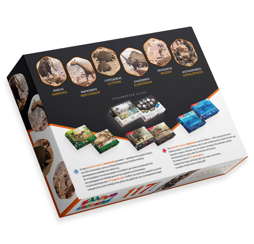 Η σειρά MASTER PUZZLE CREATORS για παιδιά 6+ προσφέρει στους μικρούς λάτρεις των παζλ εντυπωσιακές εικόνες με διάφορα θέματα και με δυσκολία σύνθεσης προσαρμοσμένη κατάλληλα στην ηλικία τους. Με το περιεχόμενο του κουτιού μπορείτε να συνθέσετε μία εικόνα με προϊστορικά ζώα που κυριάρχησαν στον πλανήτη μας μετά την εξαφάνιση των δεινοσαύρων. Η εικόνα αποτελείται από 117 κομμάτια παζλ. Συνθέστε την εικόνα και ομορφύνετε με αυτήν το δωμάτιό σας ή κάντε έκπληξη στους φίλους σας χαρίζοντάς τους ένα συναρπαστικό δώρο! 480*330mm