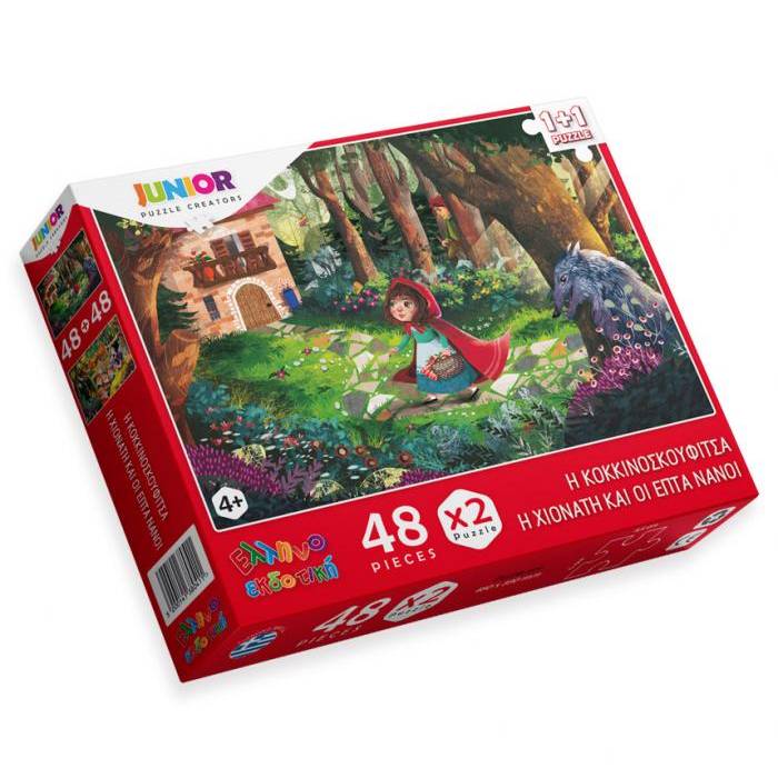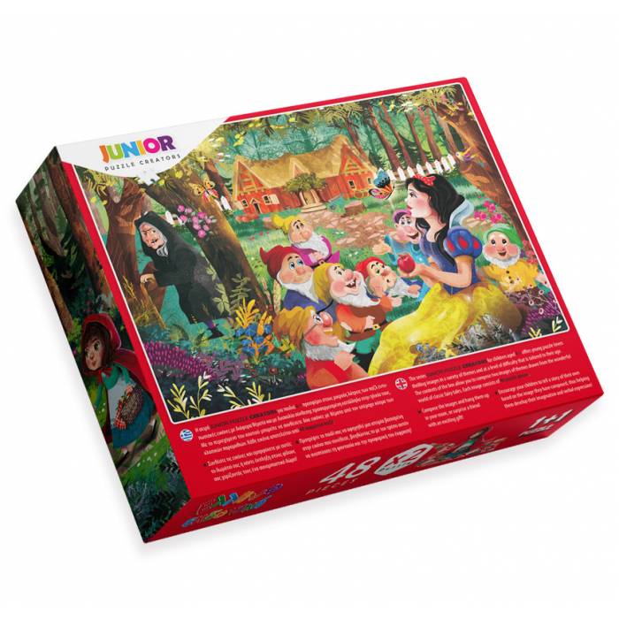 Η σειρά JUNIOR PUZZLE CREATORS για παιδιά 4+ προσφέρει στους μικρούς λάτρεις των παζλ εντυπωσιακές εικόνες με διάφορα θέματα και με δυσκολία σύνθεσης προσαρμοσμένη κατάλληλα στην ηλικία τους. Με το περιεχόμενο του κουτιού μπορείτε να συνθέσετε δύο εικόνες με θέματα από τον υπέροχο κόσμο των κλασικών παραμυθιών. Κάθε εικόνα αποτελείται από 48 κομμάτια παζλ. • Συνθέστε τις εικόνες και ομορφύνετε με αυτές το δωμάτιό σας ή κάντε έκπληξη στους φίλους σας χαρίζοντάς τους ένα συναρπαστικό δώρο! • Προτρέψτε το παιδί σας να αφηγηθεί μια ιστορία βασισμένη στην εικόνα που συνέθεσε, βοηθώντας το με τον τρόπο αυτόν να αναπτύσσει τη φαντασία και την προφορική του έκφραση!
