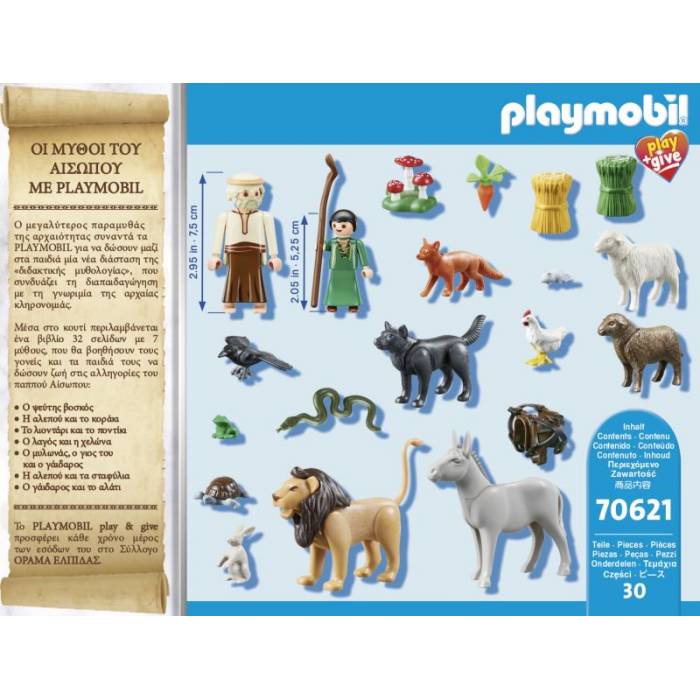 Το κοινωνικό πρόγραμμα PLAYMOBIL play & give, για 9η συνεχή χρονιά προσφέρει χαρά και υποστήριξη σε χιλιάδες παιδιά σε όλη την Ελλάδα. Όπως κάθε χρόνο, μέρος των εσόδων θα διατεθεί για την ενίσχυση των σκοπών του Συλλόγου «ΟΡΑΜΑ ΕΛΠΙΔΑΣ». Το 2020, το PLAYMOBIL play & give παρουσιάζει τον κωδικό "Οι Μύθοι του Αισώπου με PLAYMOBIL". Ο μεγαλύτερος παραμυθάς της αρχαιότητας συναντά τα PLAYMOBIL για να δώσουν μαζί στα παιδιά μία νέα διάσταση της "διδακτικής μυθολογίας", πουσυνδυάζει τη διαπαιδαγώγηση με τη γνωριμία της αρχαίας κληρονομιάς. Δώδεκα ζωάκια PLAYMOBIL αποκτούν ανθρωπόμορφα χαρακτηριστικά και διδάσκουν σύντομα και απλά για την ευγνωμοσύνη, την εμπιστοσύνη, τη φιλία και άλλες αξίες, μέσα από αυτές τις «παραβολές». Μέσα στο κουτί περιλαμβάνεται ένα βιβλίο 32 σελίδων με 7 μύθους, που θα βοηθήσουν τους γονείς και τα παιδιά τους να δώσουν ζωή στις αλληγορίες του παππού Αίσωπου: •Ο λαγός και η χελώνα •Το λιοντάρι και ποντίκι •Ο ψεύτης βοσκός •Ο Μυλωνάς, ο γιος του και ο γάιδαρος •Η αλεπού και τα σταφύλια •Ο κόρακας και η αλεπού •Ο γάιδαρος που κουβαλούσε αλάτι Κατάλληλο για παιδιά ηλικίας 4+ ετών.