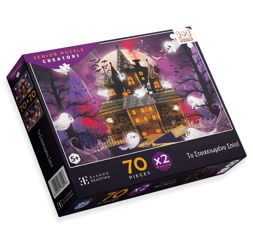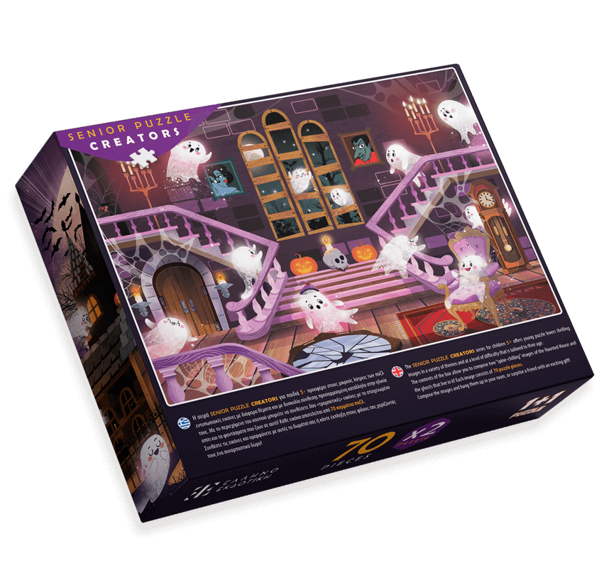Η σειρά SENIOR PUZZLE CREATORS για παιδιά 5+ προσφέρει στους μικρούς λάτρεις των παζλ εντυπωσιακές εικόνες με διάφορα θέματα και με δυσκολία σύνθεσης προσαρμοσμένη κατάλληλα στην ηλικία τους. Με το περιεχόμενο του κουτιού μπορείτε να συνθέσετε δύο «τρομακτικές» εικόνες με το στοιχειωμένο σπίτι και τα φαντάσματα που ζουν σε αυτό! Κάθε εικόνα αποτελείται από 70 κομμάτια παζλ. Συνθέστε τις εικόνες και ομορφύνετε με αυτές το δωμάτιό σας ή κάντε έκπληξη στους φίλους σας χαρίζοντάς τους ένα συναρπαστικό δώρο!