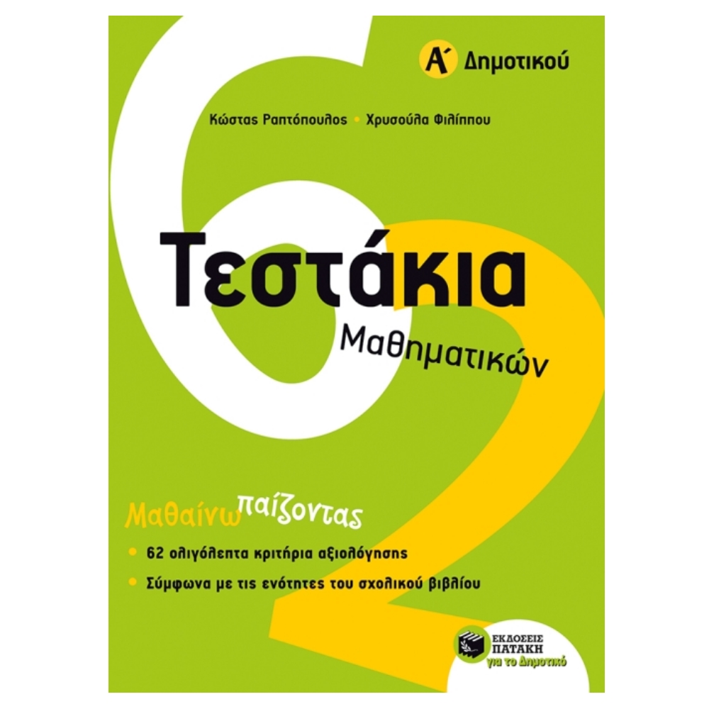 Το βιβλίο «Τεστάκια Μαθηματικών» για την Α' Δημοτικού περιλαμβάνει 61 ολιγόλεπτα κριτήρια αξιολόγησης σύμφωνα με τις ενότητες του σχολικού βιβλίου. Στο τέλος του βιβλίου δίνονται οι λύσεις με πρωτότυπο τρόπο και σε τέτοια μορφή που μπορούν να χρησιμοποιηθούν και για ομαδική διόρθωση μέσα στην τάξη. (Από την παρουσίαση στο οπισθόφυλλο του βιβλίου)