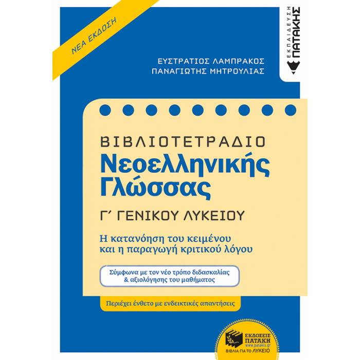 Το Βιβλιοτετράδιο Νεοελληνικής Γλώσσας - Γ' Γενικού Λυκείου απευθύνεται τόσο στους μαθητές και στις μαθήτριες όσο και στους/στις εκπαιδευτικούς. Παρουσιάζει με τρόπο εύληπτο και στοχευμένο το σύνολο της τυπολογίας των ερωτήσεων που μπορεί να ζητηθούν στις Πανελλαδικές εξετάσεις. Παράλληλα, αποτελεί ένα χρήσιμο εργαλείο που μπορεί να αξιοποιηθεί στη (σχολική ή φροντιστηριακή) τάξη, προκειμένου να προετοιμαστούν οι μαθητές και οι μαθήτριες μεθοδικά και οργανωμένα για τις Πανελλαδικές εξετάσεις. (Από την παρουσίαση στο οπισθόφυλλο του βιβλίου)