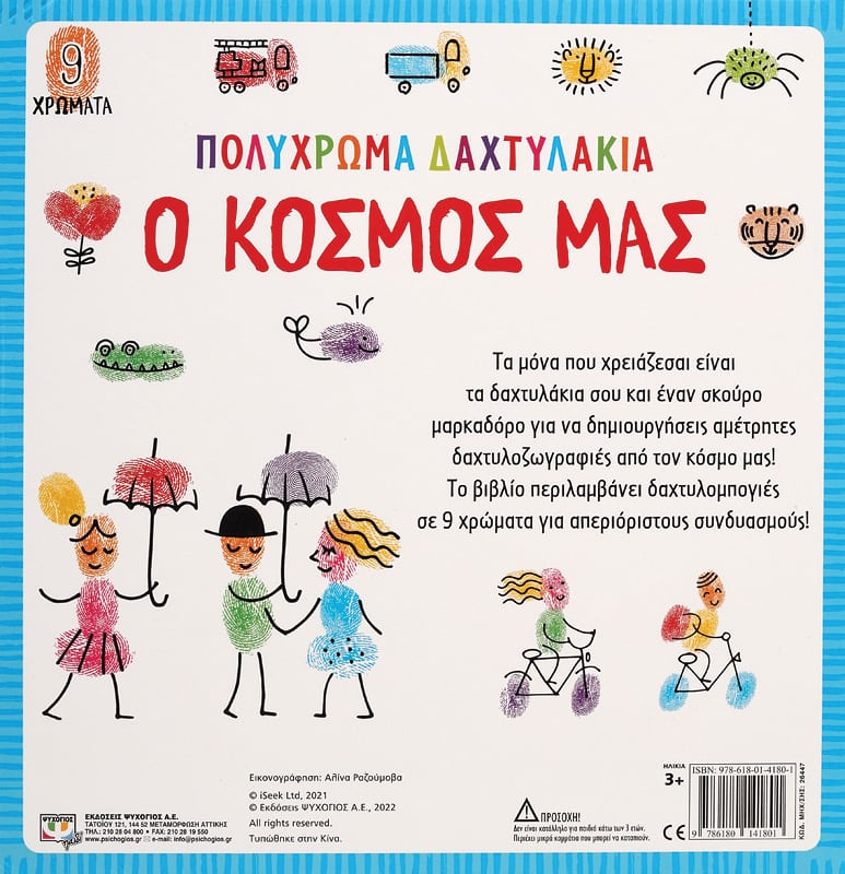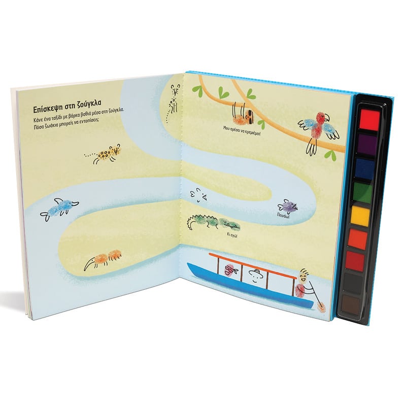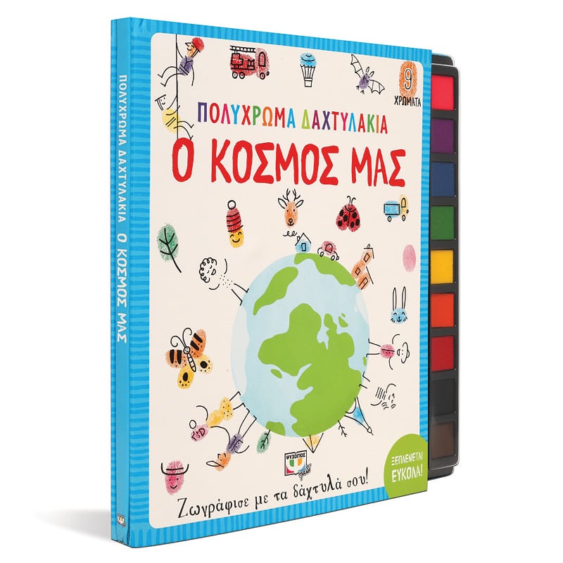 Τα μόνα που χρειάζεσαι είναι τα δαχτυλάκια σου και έναν σκούρο μαρκαδόρο για να δημιουργήσεις αμέτρητες δαχτυλοζωγραφιές από τον κόσμο μας! Το βιβλίο περιλαμβάνει δαχτυλομπογιές σε 9 χρώματα για απεριόριστους συνδυασμούς!