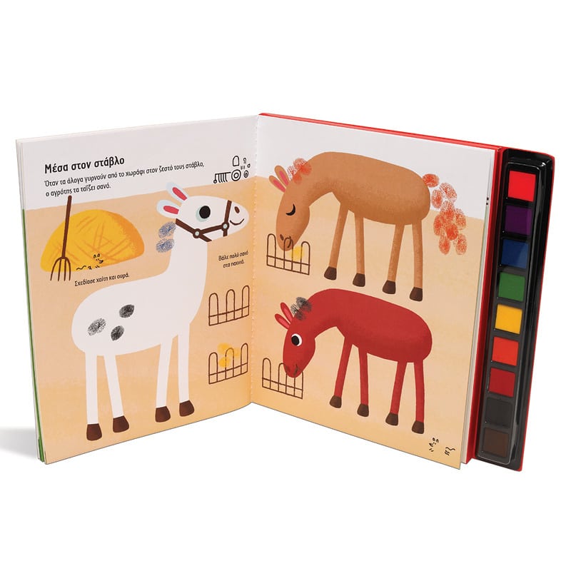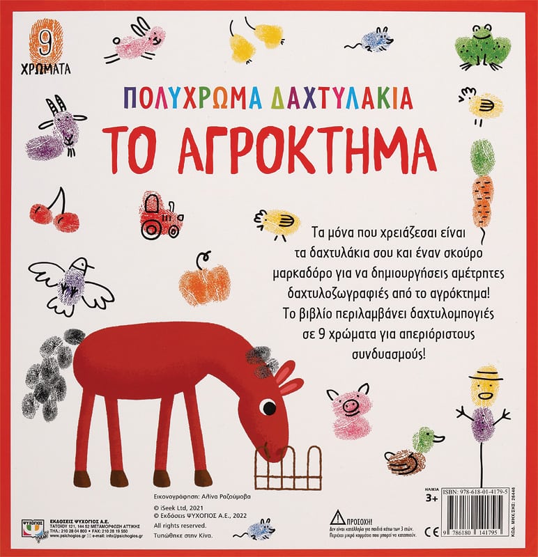 Τα μόνα που χρειάζεσαι είναι τα δαχτυλάκια σου και έναν σκούρο μαρκαδόρο για να δημιουργήσεις αμέτρητες δαχτυλοζωγραφιές από το αγρόκτημα! Το βιβλίο περιλαμβάνει δαχτυλομπογιές σε 9 χρώματα για απεριόριστους συνδυασμούς! Ημ/νία έκδοσης 10 Μαρ 2022 Σειρά Βιβλία δραστηριοτήτων Είδος Δραστηριότητες - Κατασκευές Ηλικία 3-4,5-6 Σελίδες 32 ISBN 978-618-01-4179-5 Κωδικός 26446 Σχήμα (πλάτος x ύψος) 25 x 26 cm Βάρος 0.373 kgr Βιβλιοδεσία Μαλακό εξώφυλλο