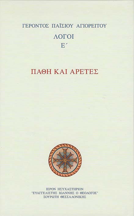 Στον παρόντα Ε' τόμο - ο οποίος εκδίδεται με την ευλογία του Ποιμενάρχου μας Σεβασμιότατου Μητροπολίτου Κασσανδρείας κ. Νικοδήμου - συμπεριλαμβάνονται λόγοι του Γέροντα σχετικά με τα πάθη και τις αρετές. Οι λόγοι αυτοί δεν αποτελούν συστηματική διδασκαλία ούτε αναφέρονται εκτενώς σε όλα τα πάθη και τις αρετές. Έχουν συγκροτηθεί από απαντήσεις του Γέροντα σε ερωτήσεις μας σχετικές με την διάγνωση και την θεραπεία των παθών, καθώς και με την εργασία της αρετής. Οι απαντήσεις αυτές δεν ενδιαφέρουν μόνον τους μοναχούς αλλά και κάθε άνθρωπο που έχει μόνον τους μοναχούς αλλά και «την καλή ανησυχία» για την καλλιέργεια της αρετής. [...] (Από τον πρόλογο της έκδοσης)